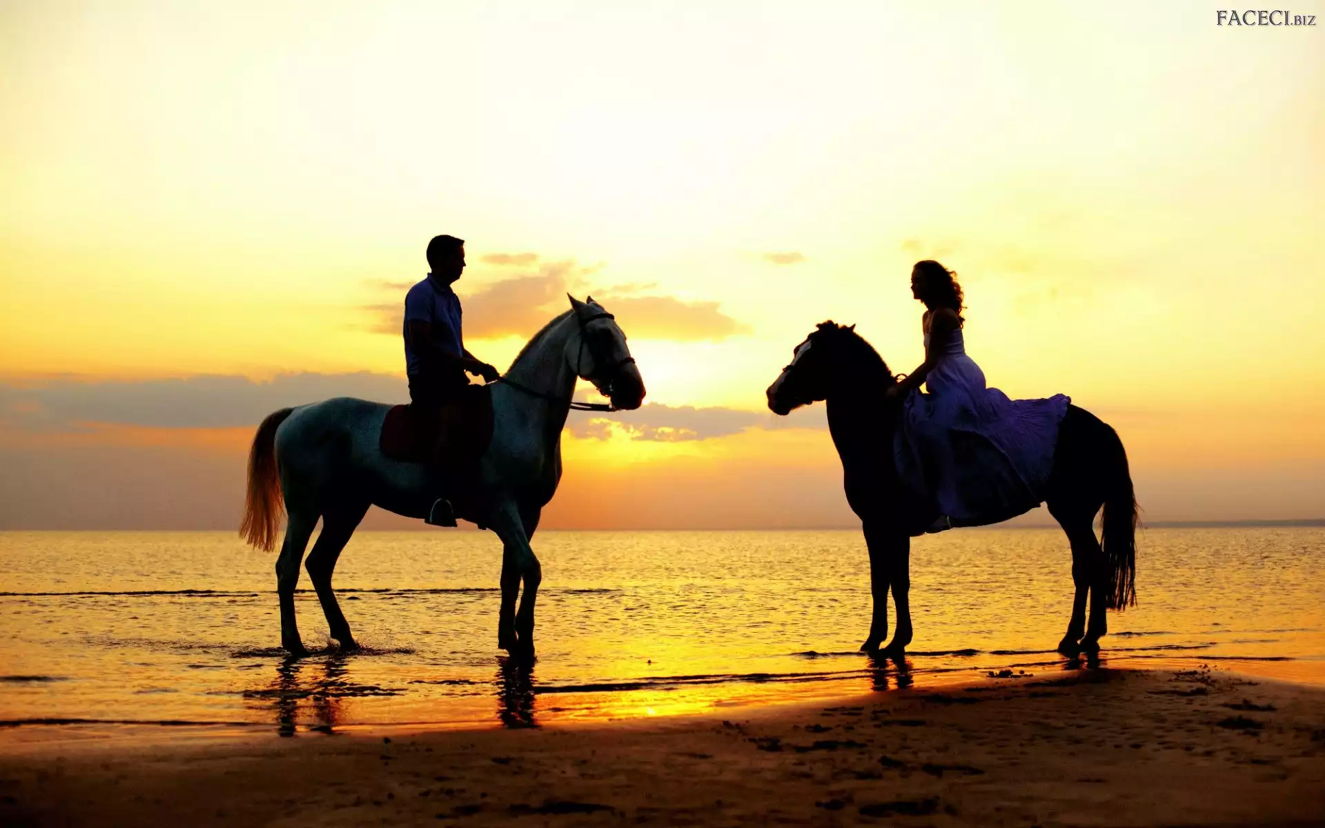 Słońca, Konie, Kobieta, Morze, Zachód, Mężczyzna, Plaża - faceci.biz